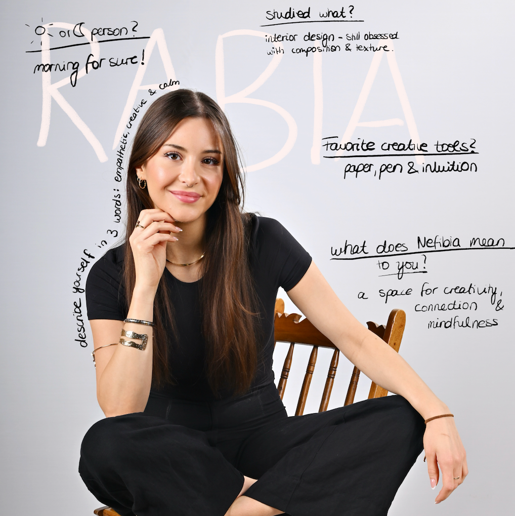 Ich bin Rabia – Gründerin von Nefibia, Künstlerin mit einem Hintergrund in Innenarchitektur und einem Gespür für das, was zwischen Menschen entsteht.